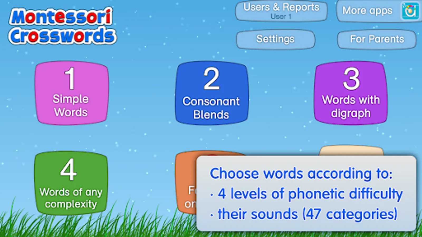 Montessori Words allows you to select words according to their difficulty or sound categories.