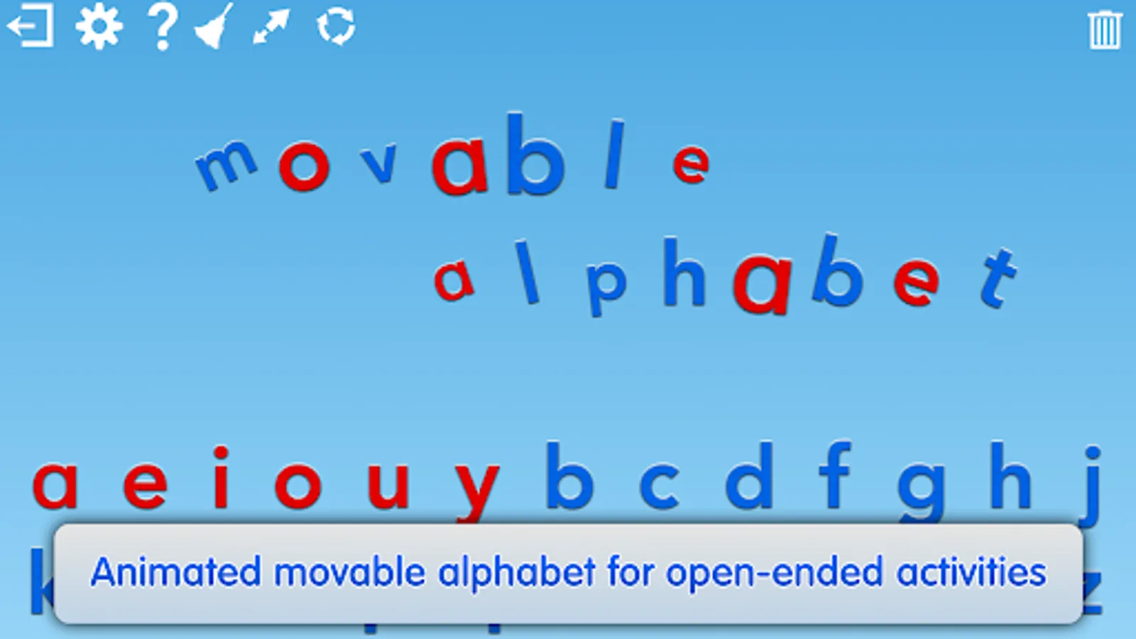 • Phonics-enabled Movable Alphabet (touch a letter to hear its sound/phonic).