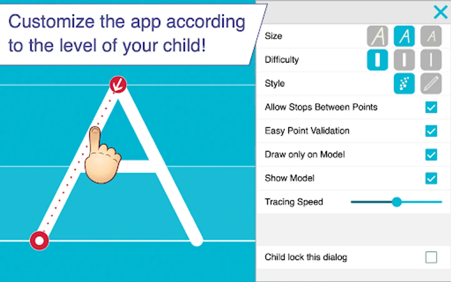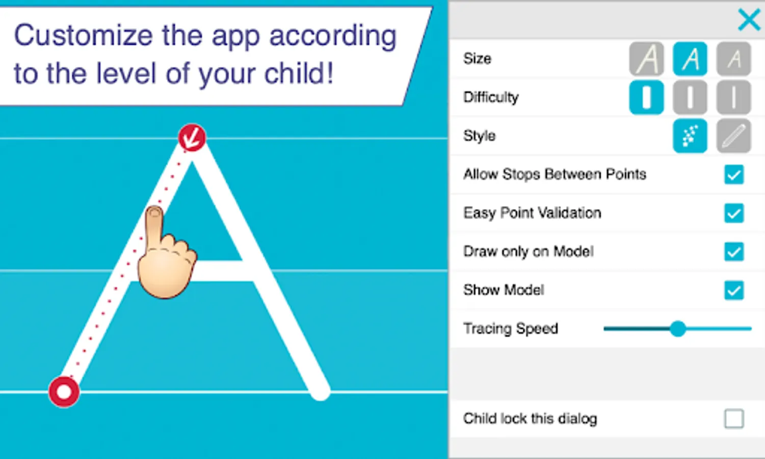 • Multiple parameters to customize the app according to child’s current education level (letter size, difficulty, show/hide model, etc.)