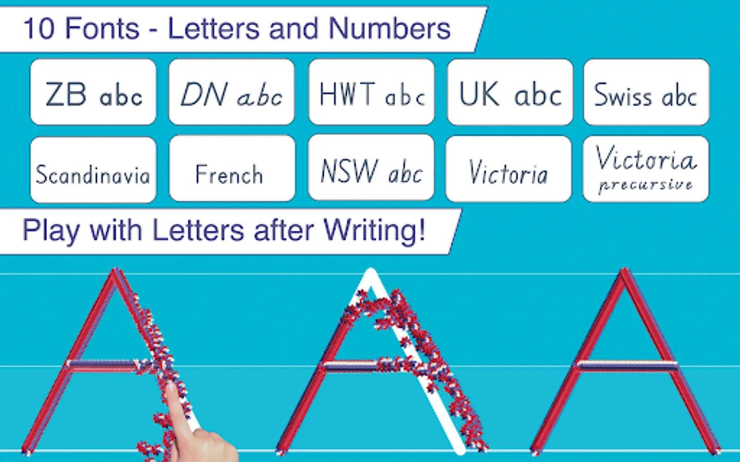 • Learn with 50+ fun animated stickers, sound effects, and interactive games that animate letters at the end of the writing