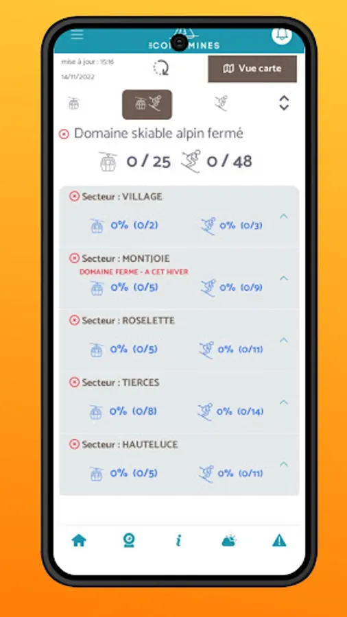 - The openings and closings of the slopes in the Alpine and Nordic areas