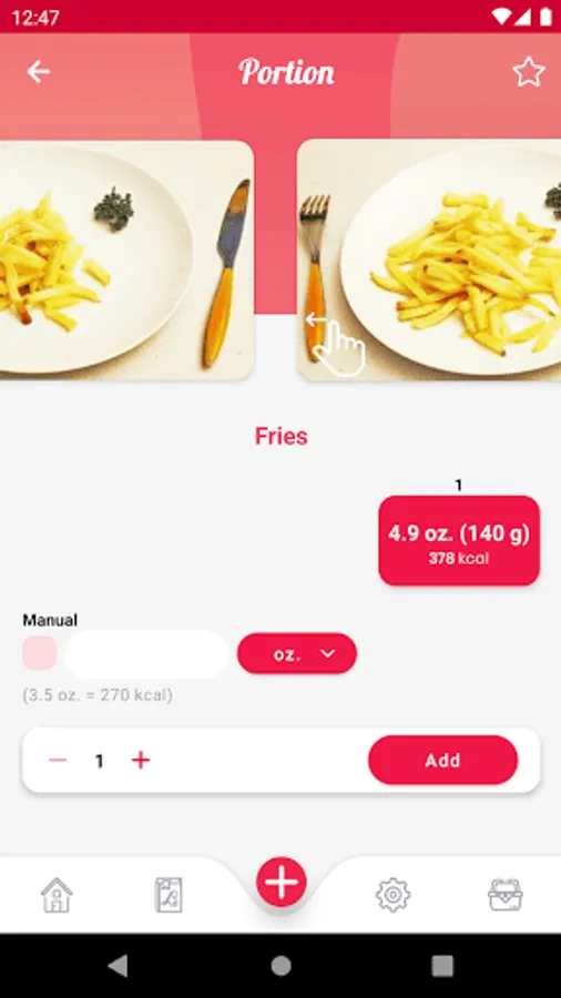 - Throughout the day, you can add the food you're having and select the portions you're having by using the food pictures. A small gauge shows you how many calories you have left to spend for that given day.