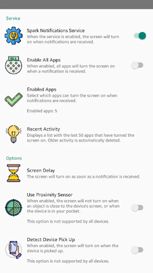 Spark Notifications allows to turn on the screen of your device when any app generates a notification. It provides the following features: