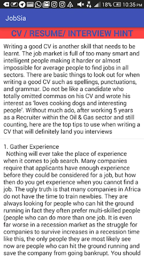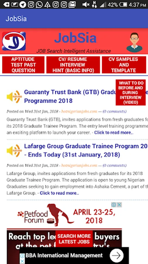 JOBSia is design to provide user on day to day search for job, it a comprehensive requirement to land a good job. it can be use During search for job, Preparation for Aptitude text by giving you access to past questions, preparing of good and standard CV/ RESUME, it also give you Resume and interview Hint