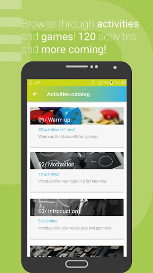 The best aid for a teacher – don’t spend time looking for a new ESL warm-up, game or any other lesson activity! With a built-in Activities catalog you can navigate through all the activities and get fresh ideas for your lesson including: