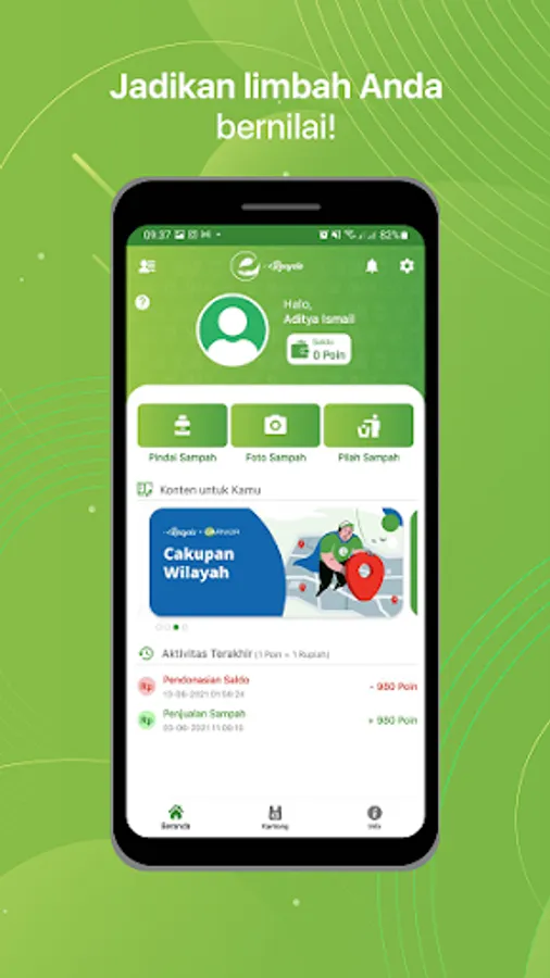 Dengan proses melalui aplikasi ini sampah terpilah Anda akan dijemput ke rumah, lalu ditimbang secara digital, akurat, dan real time. Sampah terpilah tersebut akan kami ganti berupa reward yang dapat di donasikan kepada LSM yang bekerjasama dengan kami.