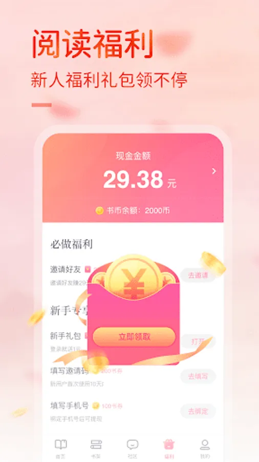 Lots of benefits: newcomer registration, check-in gift package, rose reward, self-uploading novels, self-service application for novel signing on the official website, and cash for inviting friends to read. Book coins are collected for free every day, and you can't stop reading good articles. There are also irregular top-up activities waiting for you.