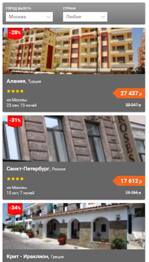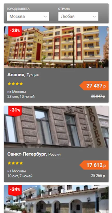 All information posted in the application is informational in nature and is not an advertisement or a public offer. The purchase (registration) of the tour of services and their payment is made on the websites (with online payments) or at the offices of third parties offering them for sale. The user of this application is notified and confirms the understanding that the owner of this application does not sell the tour of services, does not guarantee and is not responsible for the reliability of information on the services offered for sale by third parties, the implementation of cash payments, the implementation of accommodation and transportation contracts. In the event of controversy over these circumstances, the User of this application undertakes to apply for their permission directly to the persons who entered with him in relation to the sale of the tour services and / or the transfer of funds.