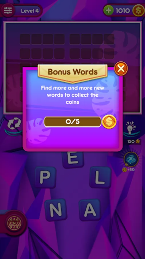 - Find as many words as possible to unlock levels and earn extra bonus coins.