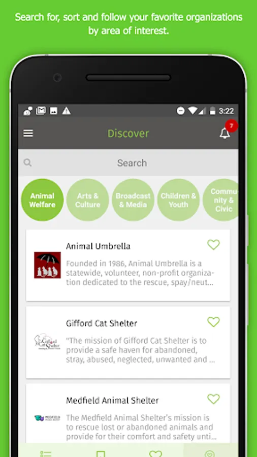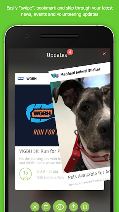 • Tap, engage, share and store your favorite organization's latest News, Events and Volunteer Opportunities by: