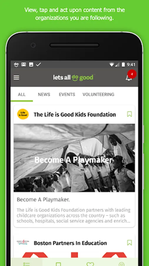 LetsAllDoGood is your “personal-good” feed customized around what you care about. No more searching your inbox, or looking for misplaced flyers. Just launch the LetsAllDoGood app and all the latest news, events and volunteering opportunities are at your fingertips, perfectly organized right on your smartphone. It’s doing good, simplified and streamlined.