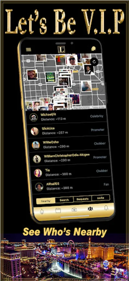 Nearby: Meet all members on the Lets Be VIP app within a ten mile radius or drag the map. Search for people by username, and add new suggested friends. Invite friends from Facebook or your contacts in your phone to join in on the fun. Real-time Entertainment all in one place!