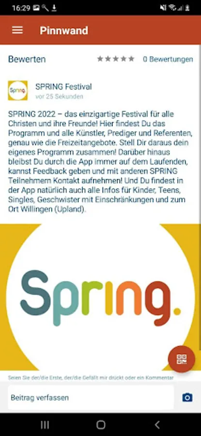 SPRING Festival – the unique festival for all Christians and their friends! Here you will find the program and all artists, speakers and leisure activities. Make your own program out of it! The app keeps you up to date and you will also find all the information for children, teens, youth, forum singles, people with disabilities and the town of Willingen (Upland).