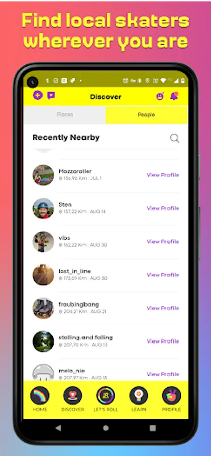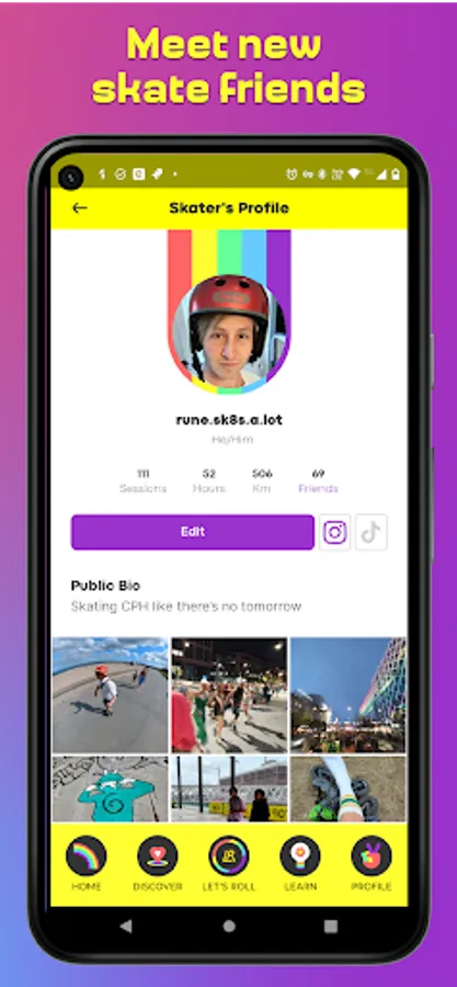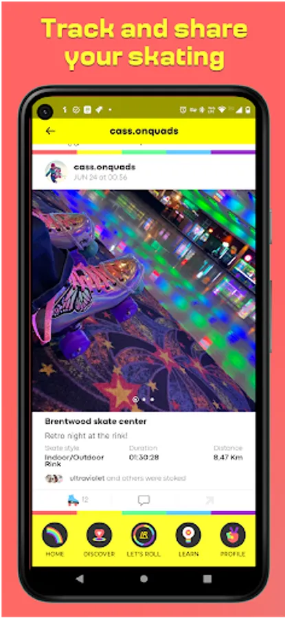 Using GPS data we connect you with roller skaters in your area. The Let’s Roll App shows you who is skating near you and lets you connect directly with local skaters. You can keep up with sessions and activities in your neighborhood - or bring the app with you when you travel to meet up with skaters in new places.