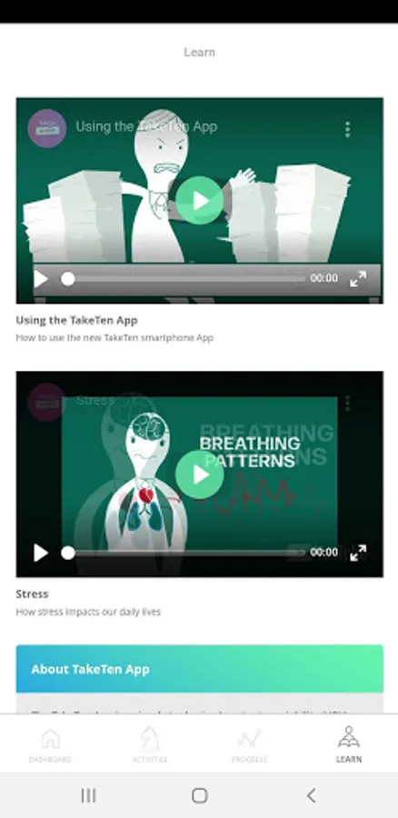 Take Ten is a stress control training app that’s designed to give you a head start. By training your body and mind to work together to become more resilient to stress, you can improve your performance in work, in school or in life, a little every day.