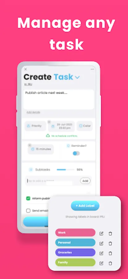 Unlike other task manager apps, Vervo makes it simple to differentiate private from professional tasks which helps you stay organized both at home with your spouse and kids, and at work with your team/employees. You can set up custom reminders so you never miss anything.