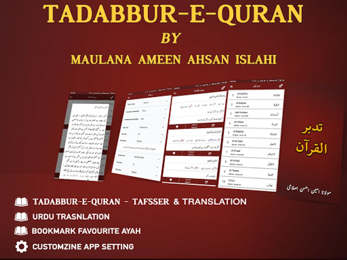 Tadabbur-e-Quran (Urdu: تدبر قرآن) is a tafsir (exegeses) of the Qur'an by Amin Ahsan Islahi based on the concept of thematic and structural coherence, which was originally inspired by Allama Hamiduddin Farahi. The tafsir is extended over nine volumes of six thousand pages (wikipedia).