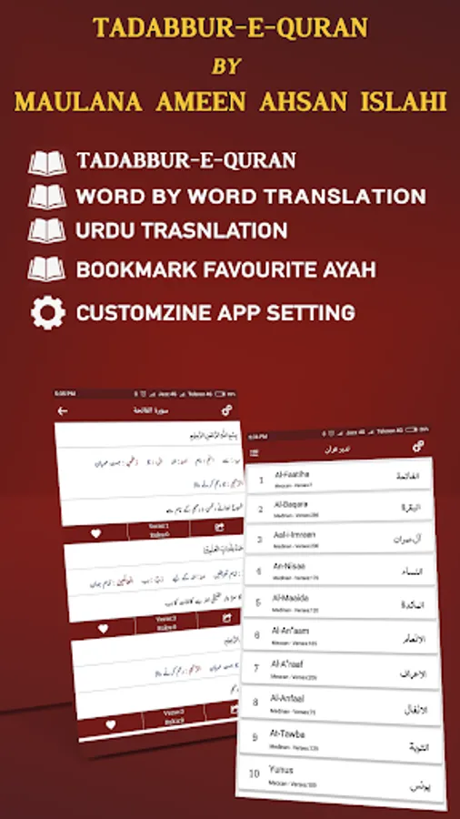 By using this app user can easily understand quran, Read Quran, book mark ayah, can easily switch to Dark Mode, Night Mode and default mode. User can easily select different themes, fonts families and fonts sizes for Quran words and its translation. There are 3 different modes available in our app simple mode (Mushaf Mode Only Arabic), Arabic and translation mode (Which also include word by word translation), and Tafseer mode.