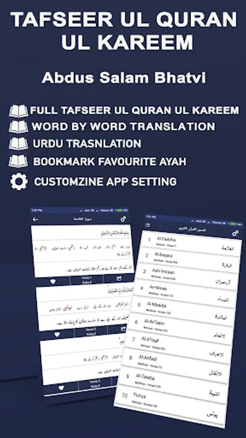 By using this app user can easily understand quran, Read Quran, book mark ayah, can easily switch to Dark Mode, Night Mode and default mode. User can easily select different themes, fonts families and fonts sizes for Quran words and its translation. There are 3 different modes available in our app simple mode (Mushaf Mode Only Arabic), Arabic and translation mode (Which also include word by word translation), and Tafseer mode.