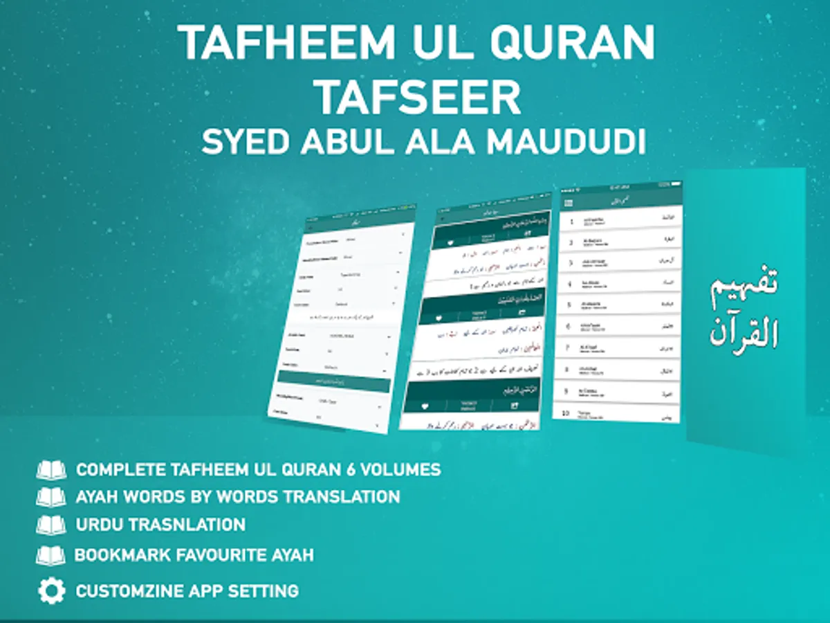 Tafheem-ul-Quran Urdu Tafseer (Tafsir) and Quran Translation (Towards Understanding the Quran) written by modernist and orthodox Islamic scholar Syed Abul Ala Maududi.