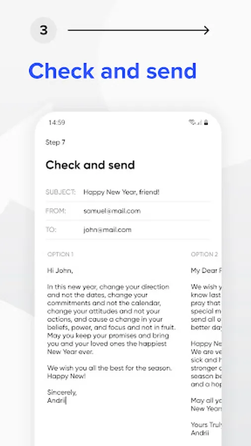 FAST. In order to made email letter in English, you need only a few steps: choose the purpose of the letter, fill in the basic details for the letter, check the finished letter and send via an email app.