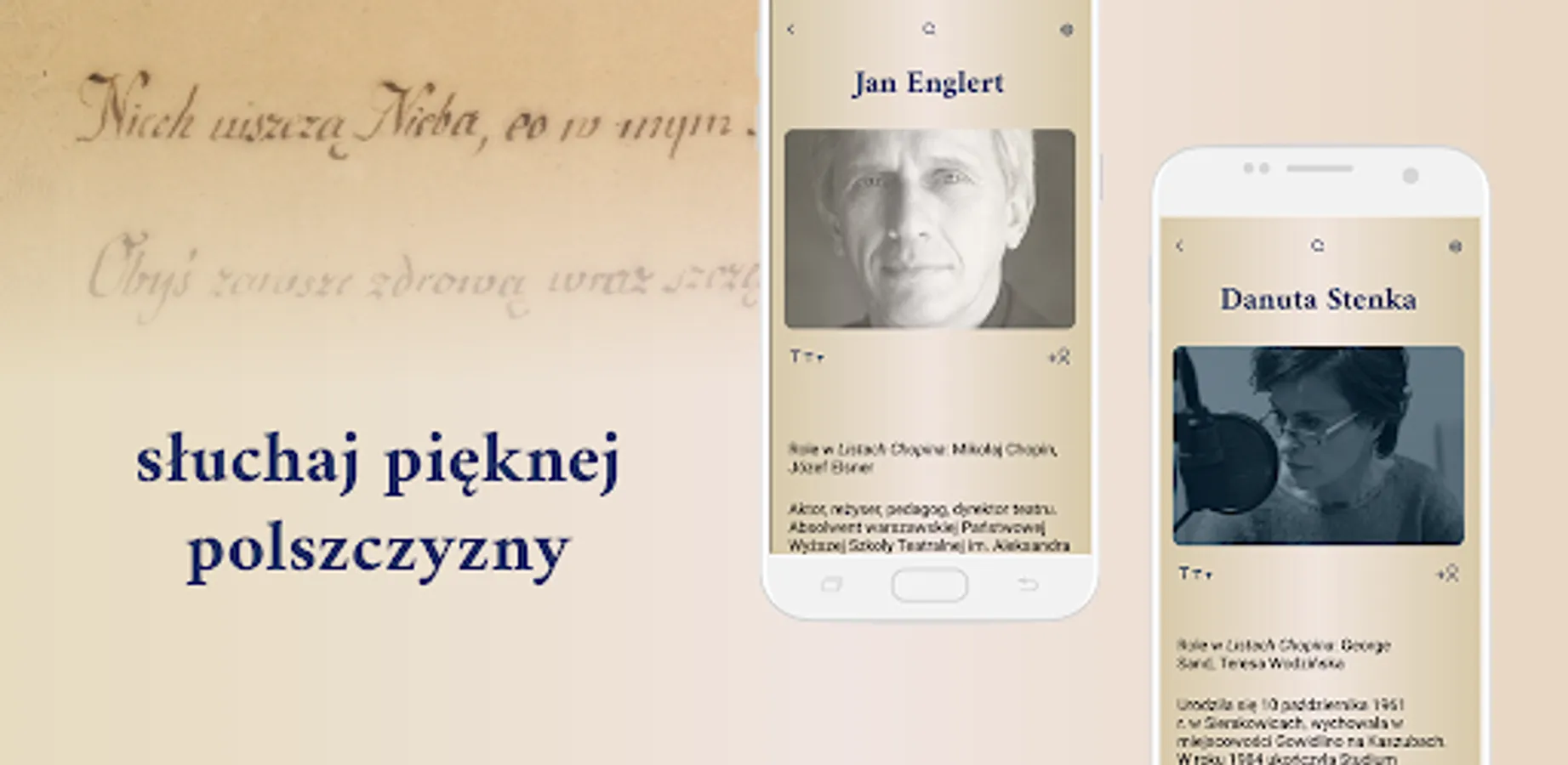 We present the complete correspondence of Fryderyk Chopin - letters written by the composer and addressed to him. Fryderyk Chopin, George Sand, Stefan Witwicki, Fr. Antoni Radziwiłł, Józef Elsner, Adam Mickiewicz and others in great acting creations. We invited a group of eminent actors to cooperate: Zbigniew Zamachowski, Danuta Stenka, Karolina Gruszka, Jan Englert, Grażyna Barszczewska, Jacek Rozenek, Joanna Szczepkowska and Grzegorz Martyna.