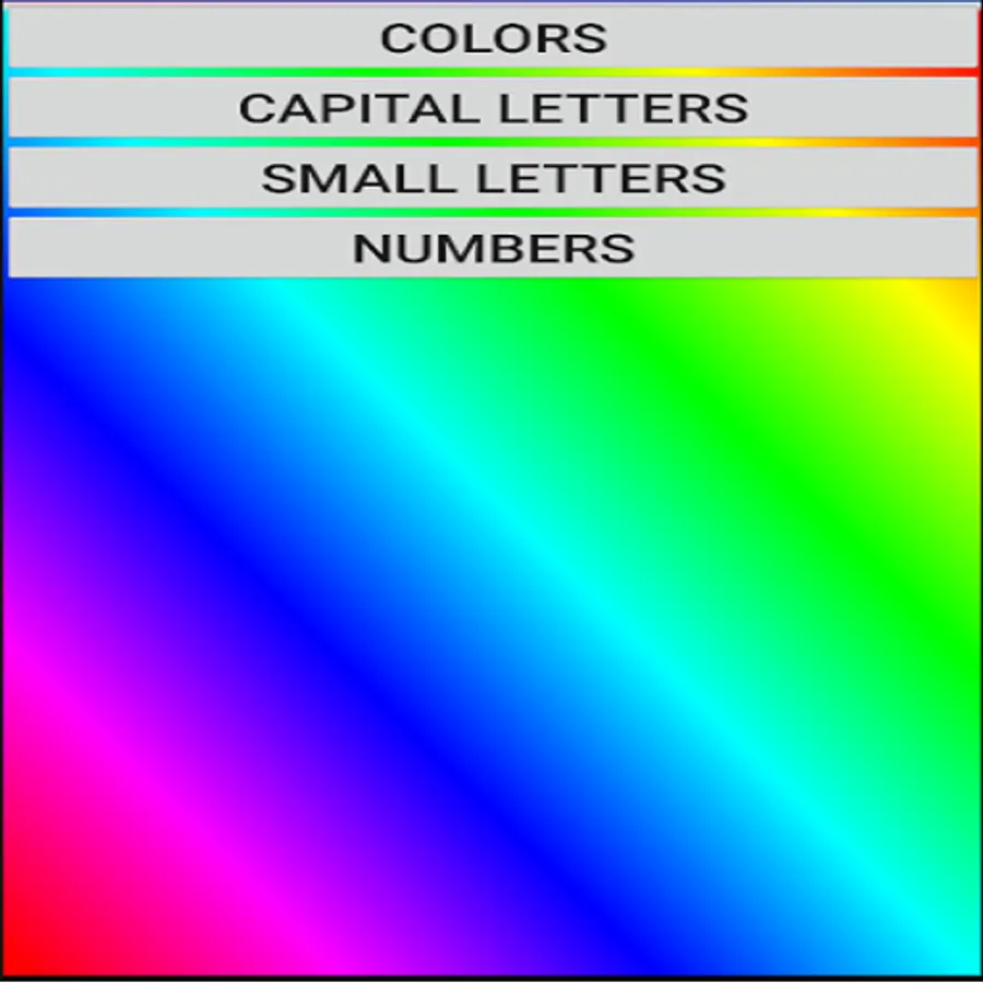 The main activity has four buttons colors, capital letters , small letters and numbers.