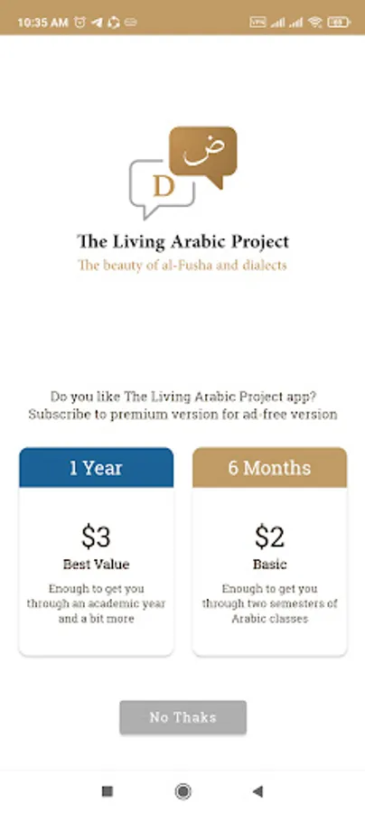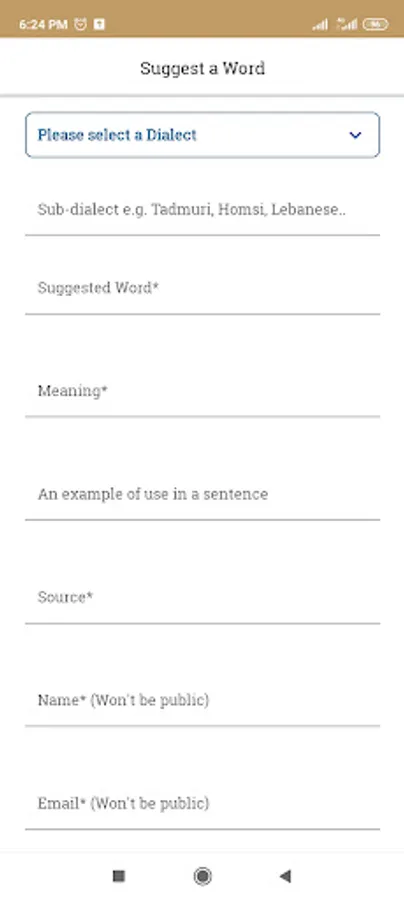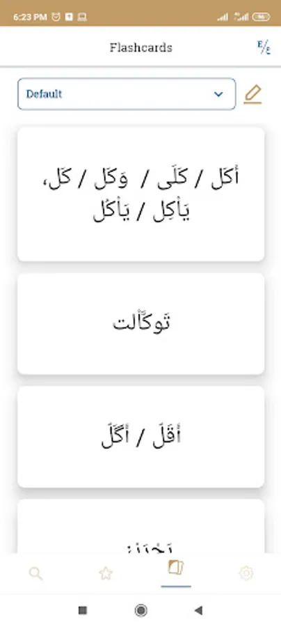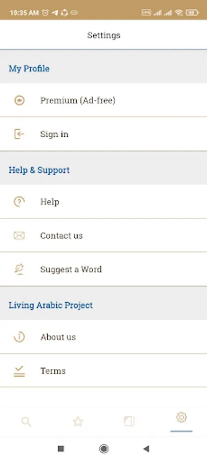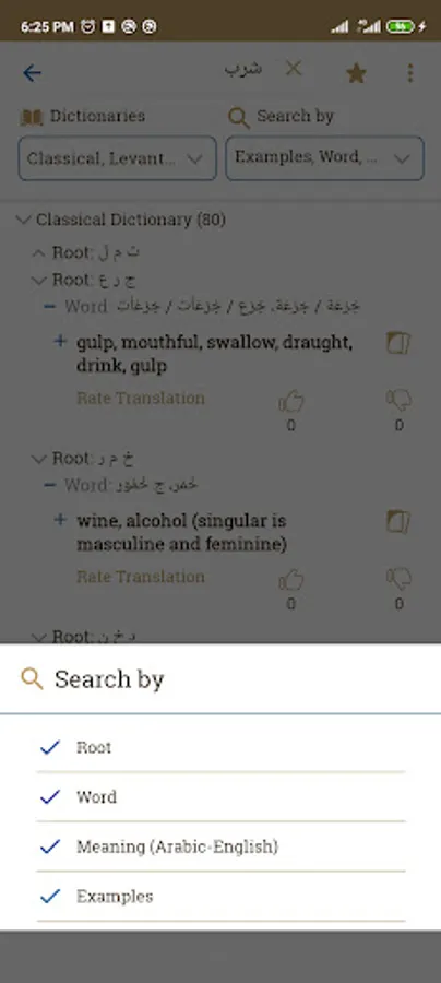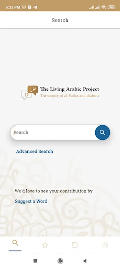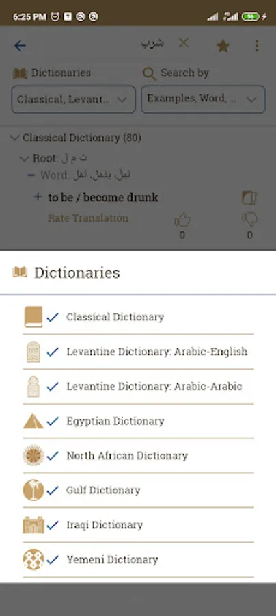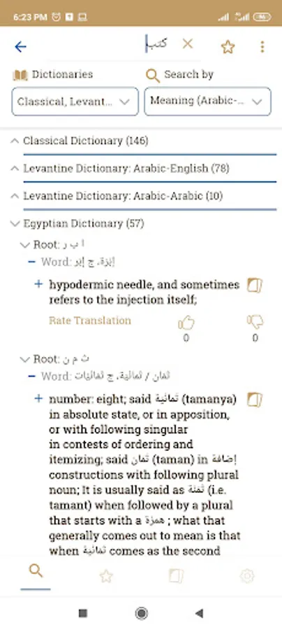 An Arabic-English dictionary for Classical Arabic (MSA) and dialects including Levantine, Egyptian, Maghrebi, Iraqi, Gulf, Yemeni, and Sudanese dialects. The dictionary features over 200,000 definitions and example phrases. Also, it allows users to search by Arabic root, Arabic word, English word, example, or phrase. Users can select multiple dialects to search in simultaneously. The dictionary also features the ability for users to save favorite searches, save words to custom flashcard lists so they can test themselves, and the ability to customize the font size in the display. The dictionary is constantly updated with new data.