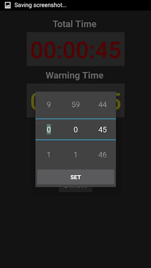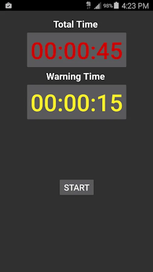 • Set overall time – screen is green with countdown timer until warning time reached.