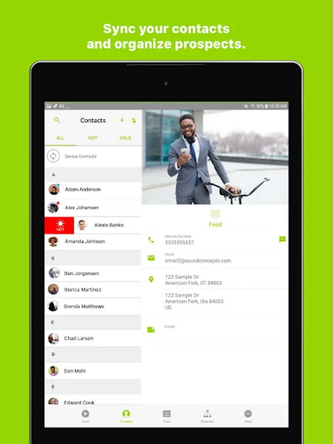 Contacts: Choose how to sync and manage your contacts. Swipe to sort them by interest level. You can make connections, add notes, or check out the Contact Feed to see the tools you’ve shared and contact actions.