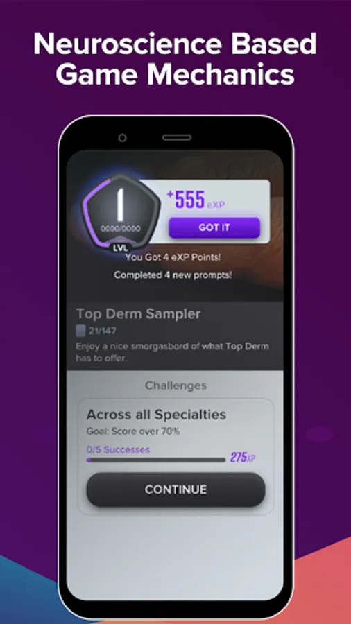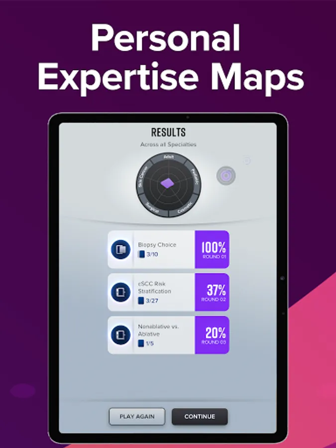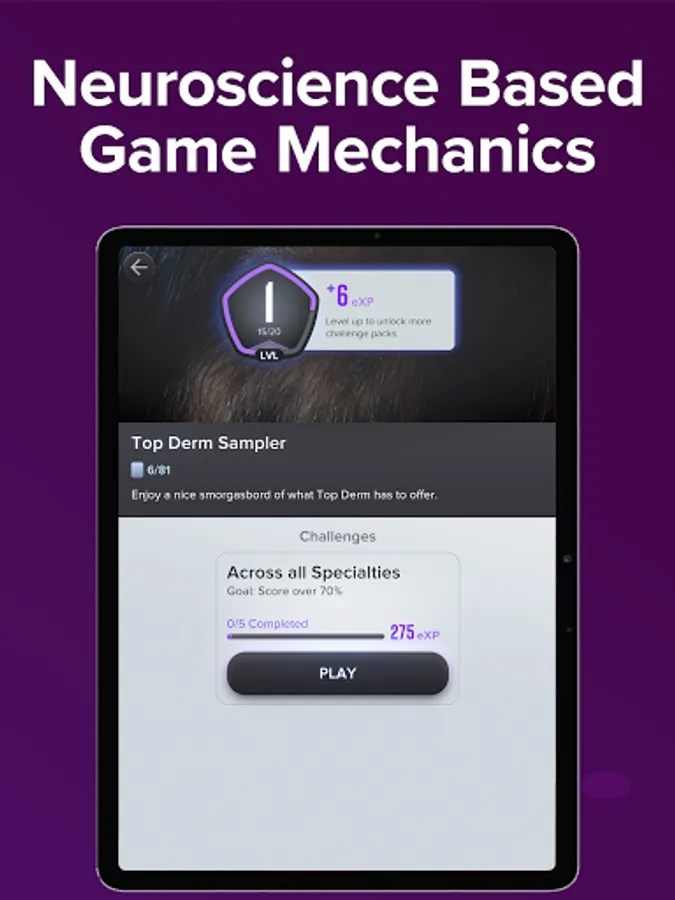 Top Derm is backed by neuroscience-based game mechanics that help you acquire and retain knowledge. It’s also a ton of fun and ready to go on your phone at any time. So whether you’re between patients, on a lunch break, or just sitting down to relax, Top Derm is waiting for you.
