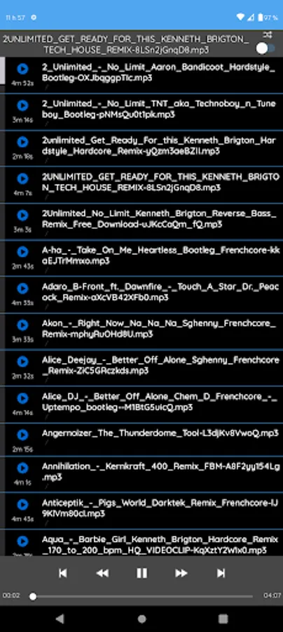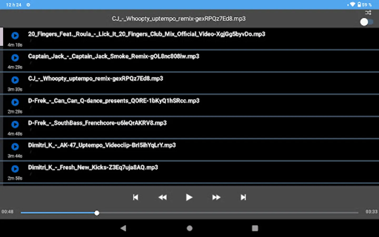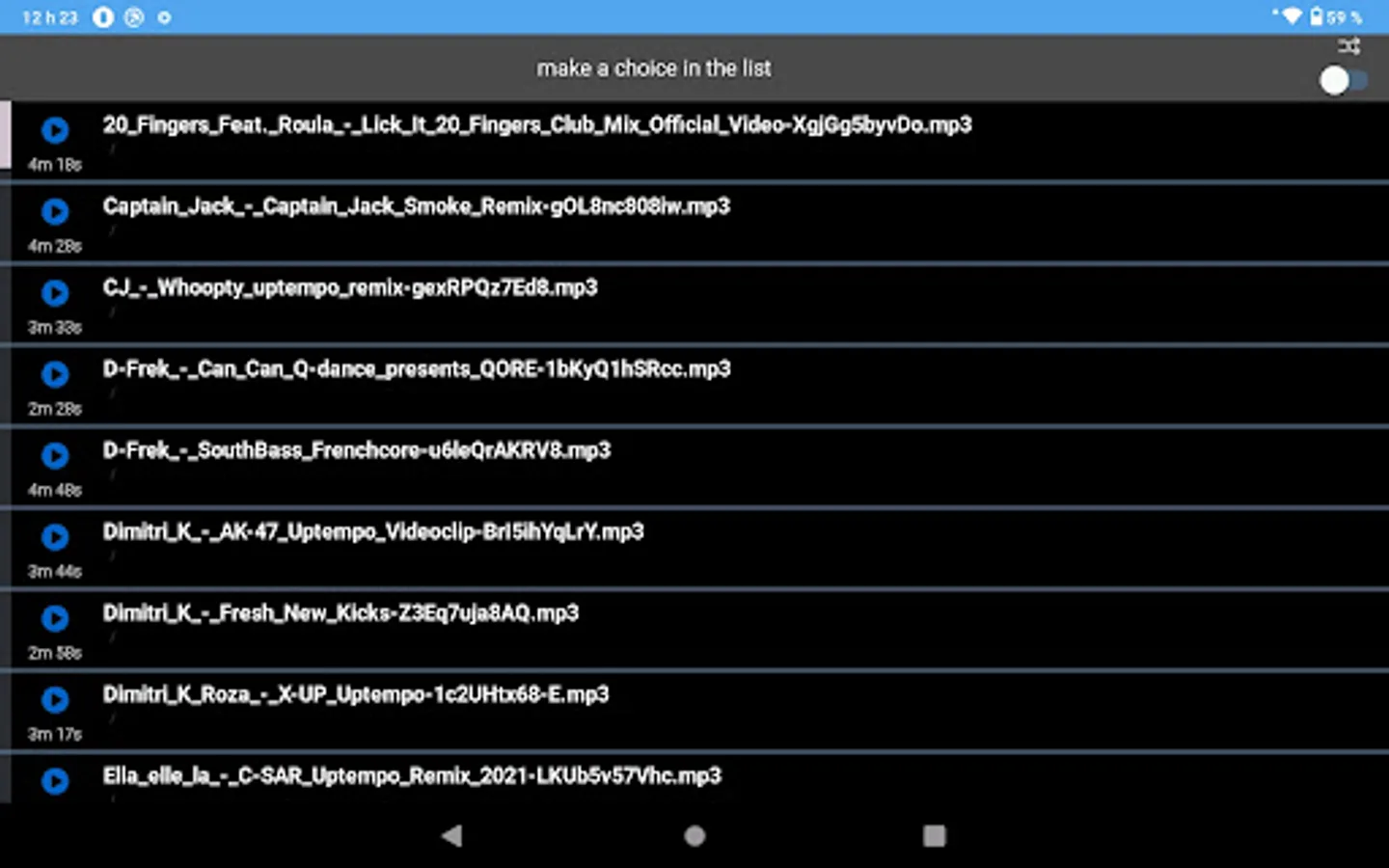 Super simple music player. Add your mp3s to your device's "Music" folder and simply listen to the tracks. The tracks only displays the file name and duration.