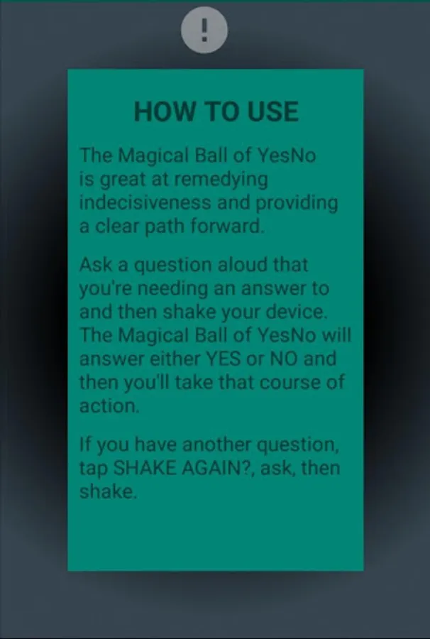 Ask a question aloud that you're needing an answer to and then shake your device. The Magical Ball of YesNo will answer either YES or NO and then you'll take that course of action.