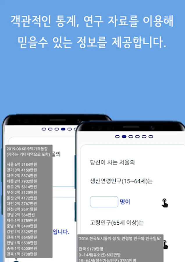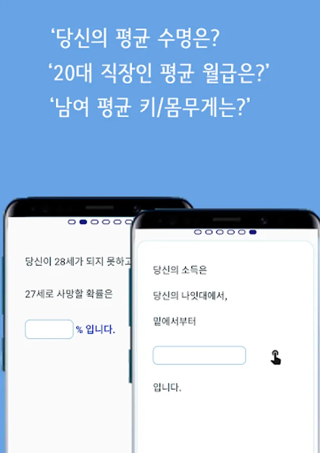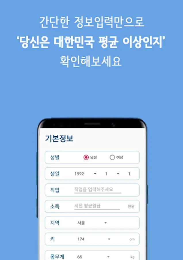 간단한 정보만으로 대한민국의 평균, 그리고 자신의 위치를 알아볼 수 있는 어플입니다.