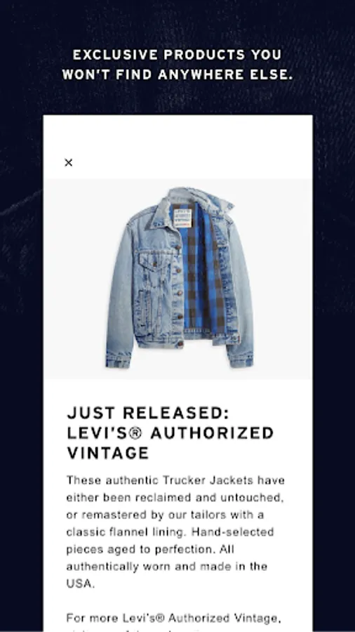 The best of Levi’s®, tailored just for you. From exclusive product launches to personalized recommendations, we’re making it easier than ever to be part of our world. Download it today and access: