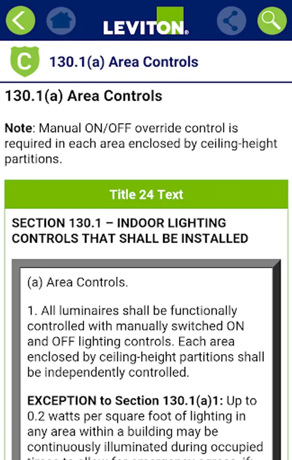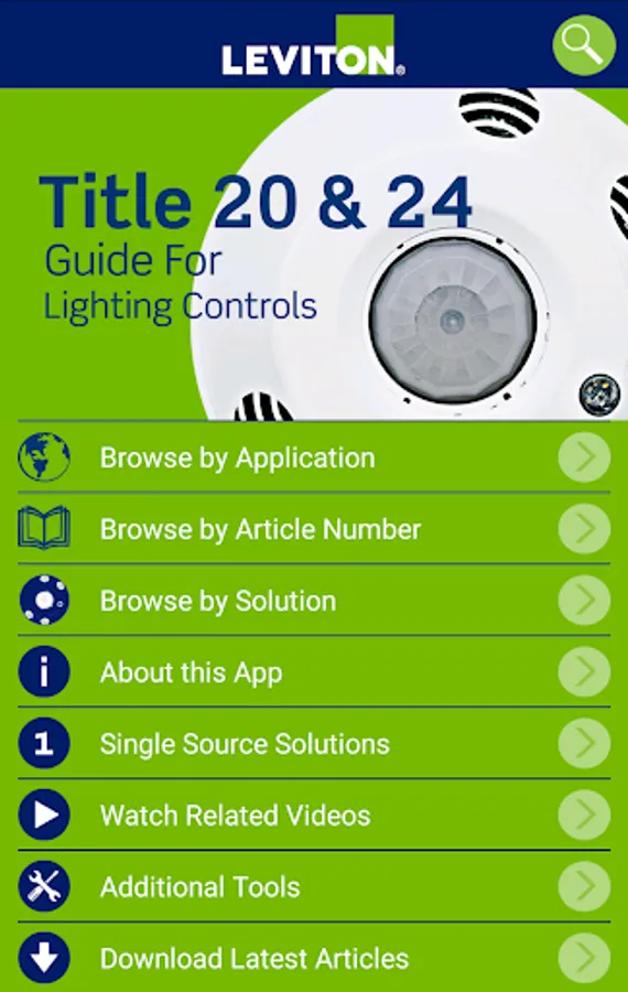 The Leviton Title 20 & 24 app simplifies California Title 20 & 24 2013 lighting controls code requirements. This powerful app organizes Title 20 and Title 24 information and makes it easily accessible and readily available with a simple swipe on your smart device. Search by application, code language and recommended Leviton solutions to get inspiration for designing code compliant applications. Examples include residential indoor, residential outdoor, classrooms, offices, retail and restaurant spaces. View diagrams and summaries of the code requirements met for recommended solutions. You will also be able to access videos and other design tools like our easy to follow Title 20 Line Card, Title 24 Design Guide and exclusive Code Assist Services.
