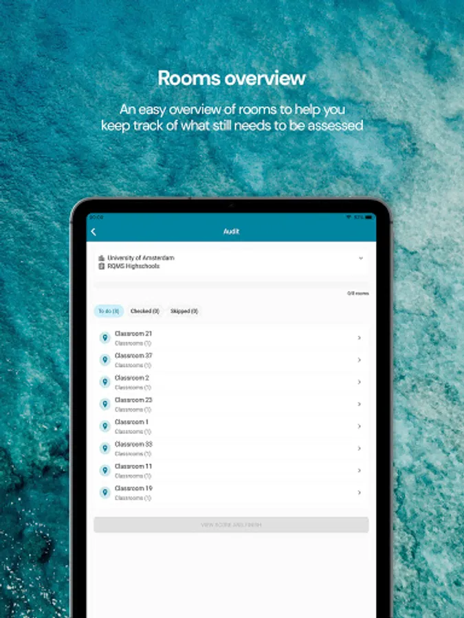 The Result-oriented Quality Management System (RQMS) is a quality audit method certified in accordance with the BS EN 13549:2001 standard. A quality audit system in which elements are divided into assessment groups per room category and in which the rooms and their elements are randomly assessed for cleaning quality according to prescribed definitions.