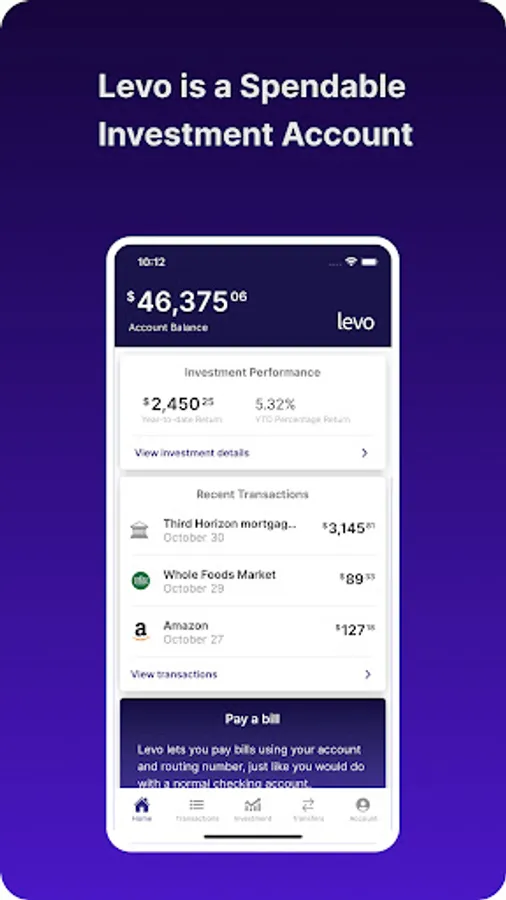 Deposit your paycheck straight to your Levo account. Spend directly from your investment portfolio with your Levo debit card. Pay your bills using your Levo account and routing number. Unlike other investing platforms, we believe accessing your money should be just as easy as depositing it.