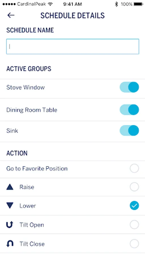 + Create custom schedules to program your window coverings to adjust automatically according to a timed schedule. Set your shades to rise with the morning sun, or move periodically throughout the day while you're away from home.