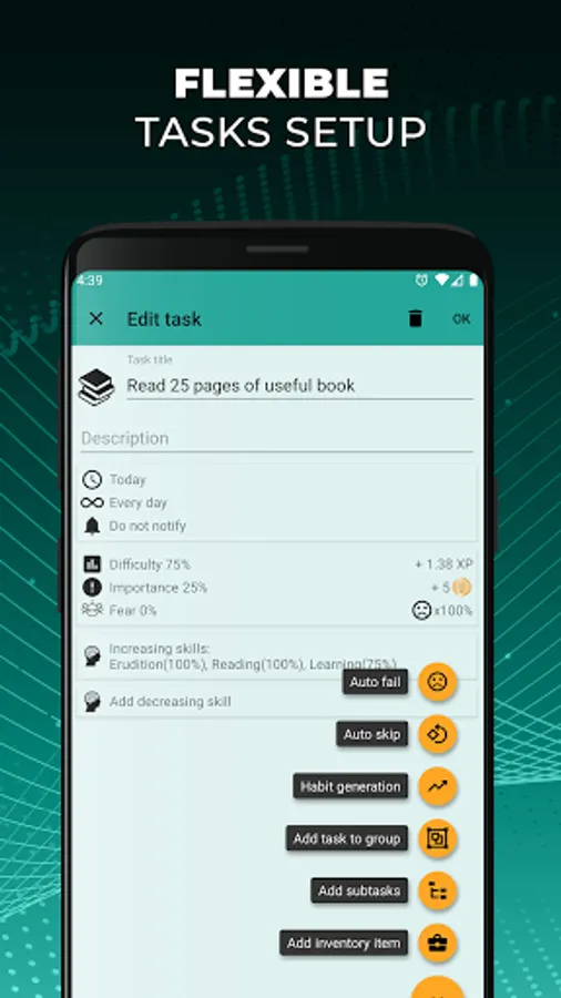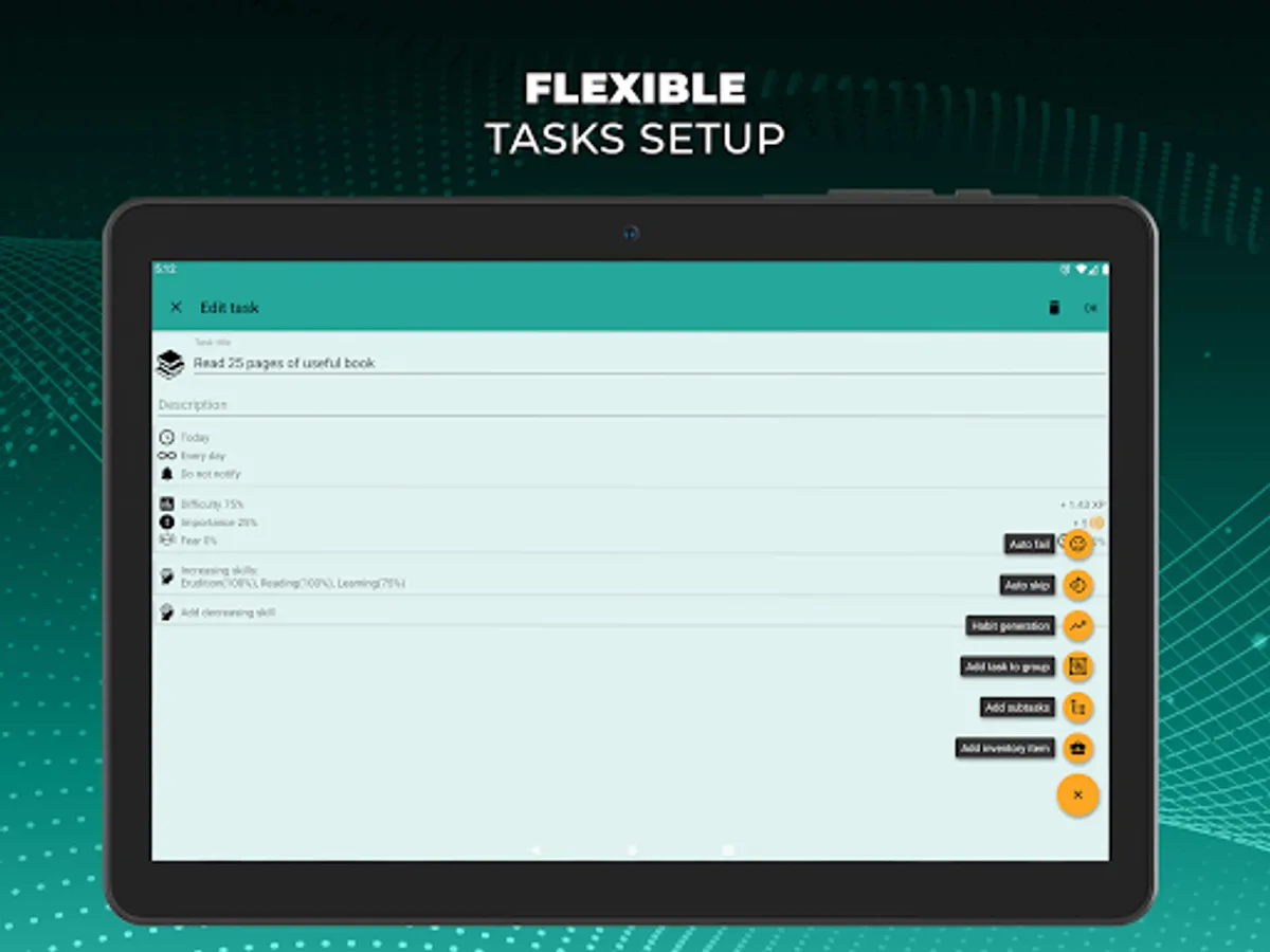 Productive habit tracker allows to add really flexible tasks. Setup custom repetitions (daily, weekly, weekdays, or monthly todoist), infinite repeats, finish datetime, difficultyimportancefear, auto-fail or auto-skip on overdue, bind negative and positive skills, combine tasks in groups, add subtasks and much-much more. Prioritize goals and focus on the what really matters to do it tomorrow. Also lots of icons included to customize your tasks. Make goal setting easy.