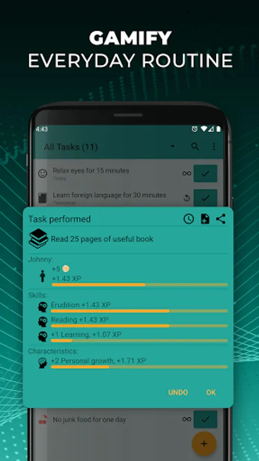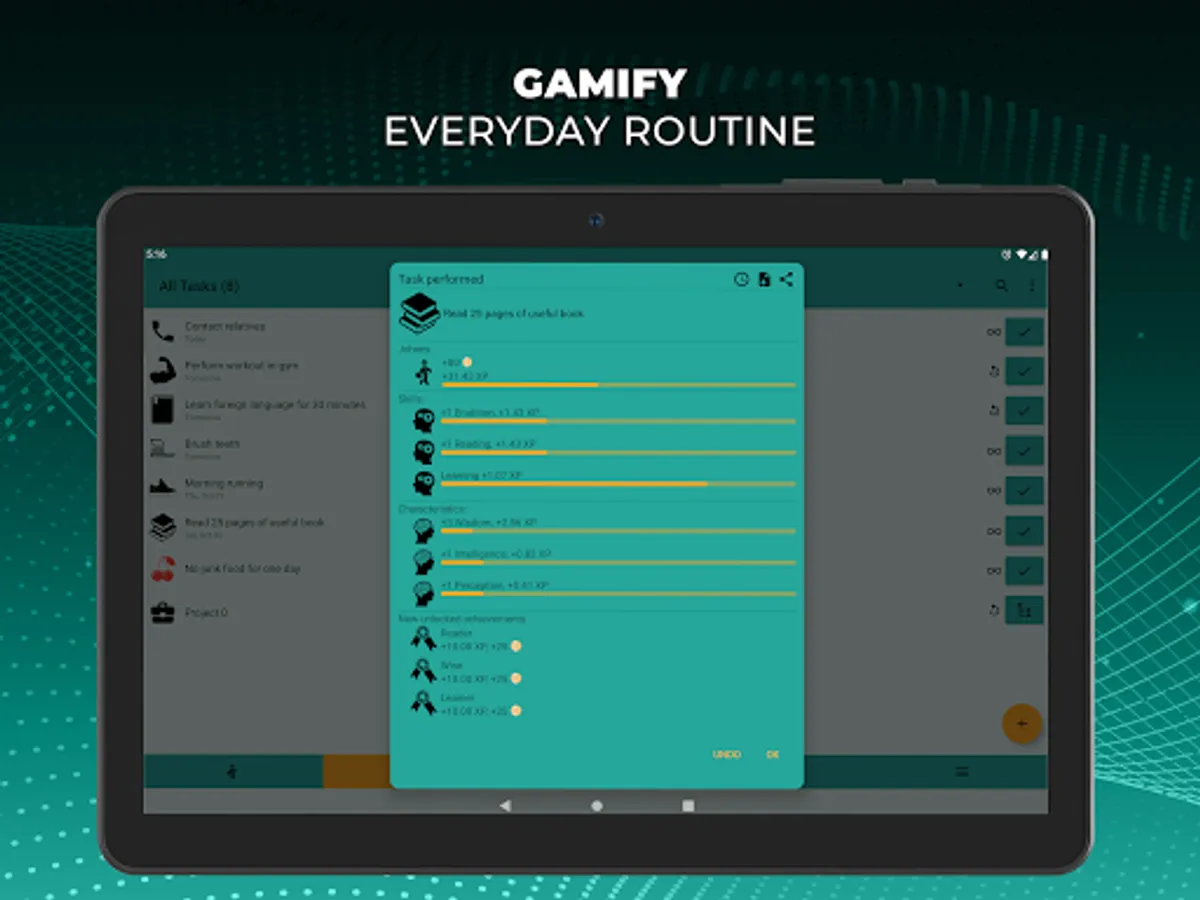 Gamify your routine to do list and improve yourself, your life and virtual RPG character with goal tracker. His skills and abilities will grow with yours. Make him more powerful and become more productive.