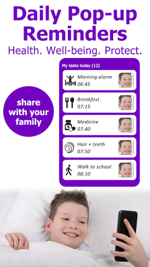 - you can create daily recurring tasks (and add pictures and photos) that will popup automatically on your loved ones phone at just the right time. And you receive a notification when they do the task or if they forget. Create tasks for your family, such as, taking medicine, doing some exercise, reading or school work, washing hands, or perhaps a reminder to clean their bedroom, …