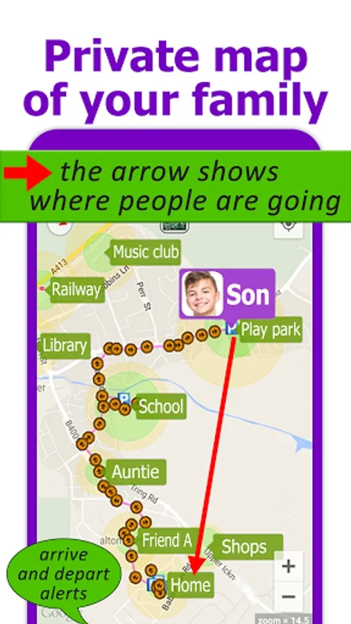 - app location alerts will tell when he arrives at the shops, or alert you if he wanders off and goes too far away. And the app is useful every day as it can notify you when your loved one arrives at school, and whenever they leave school.