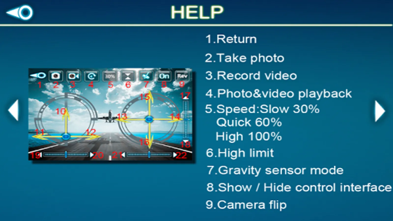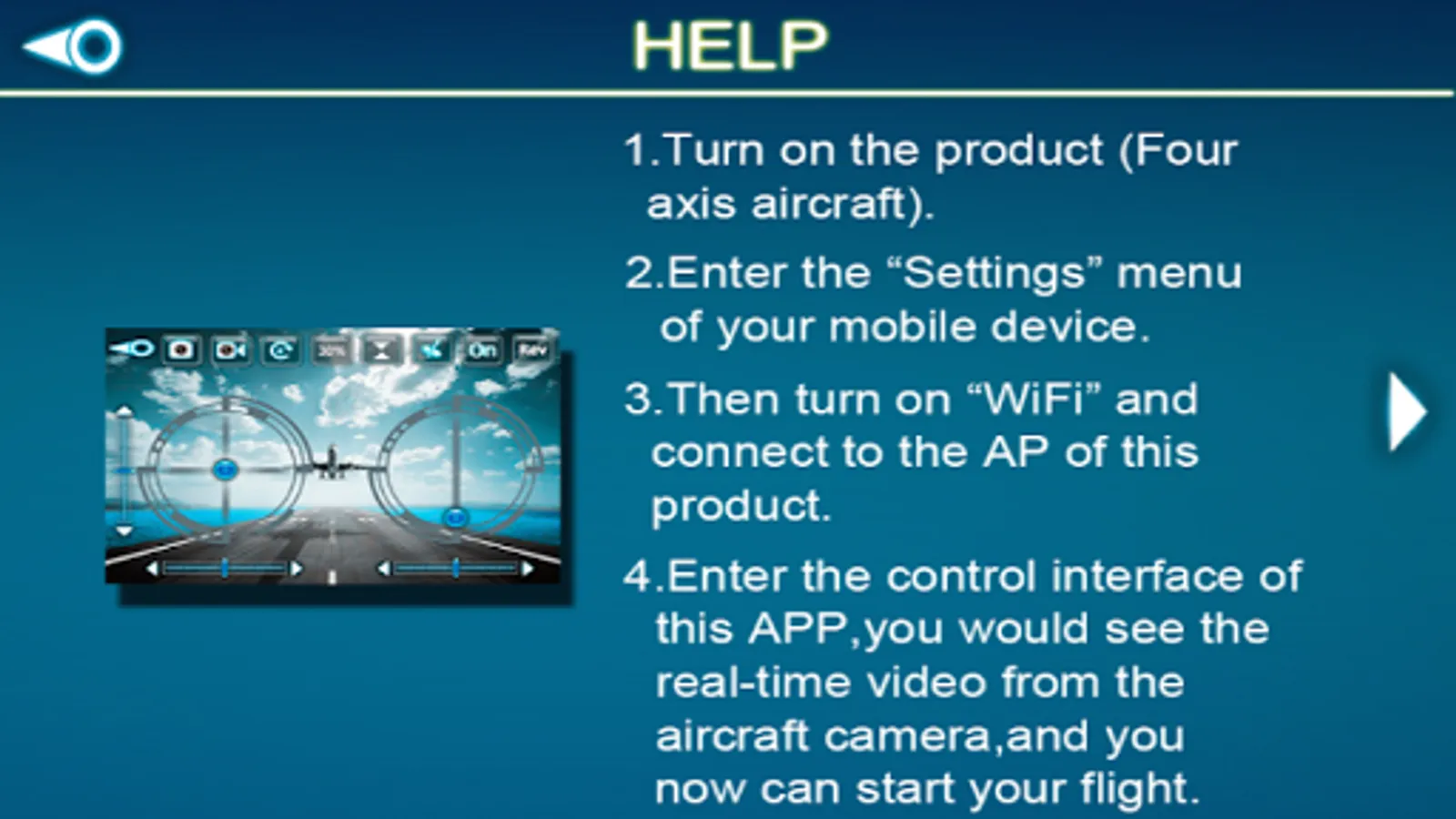 Use the application to connect the WiFi camera device, you will be able to receive the camera view and take pictures ,Record videos,control drone.