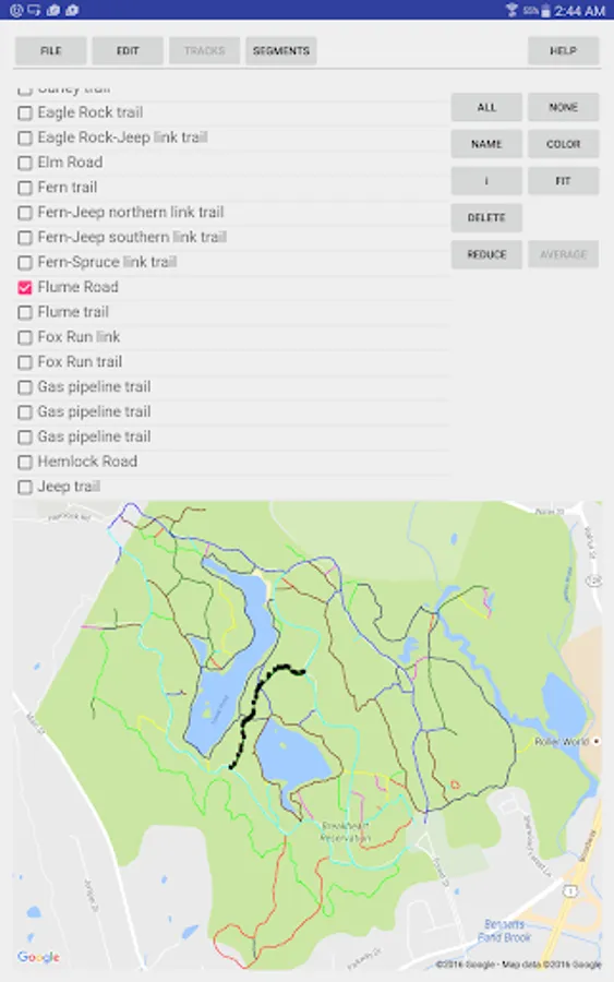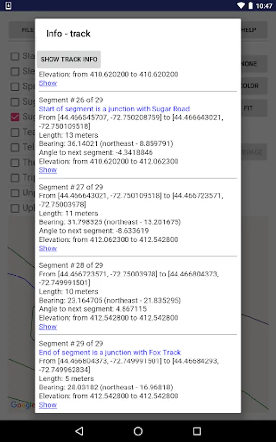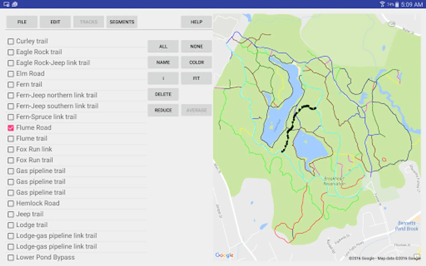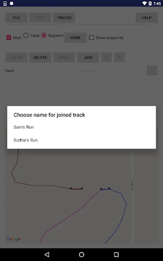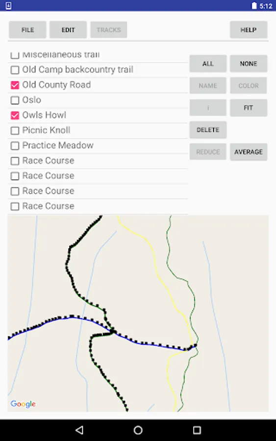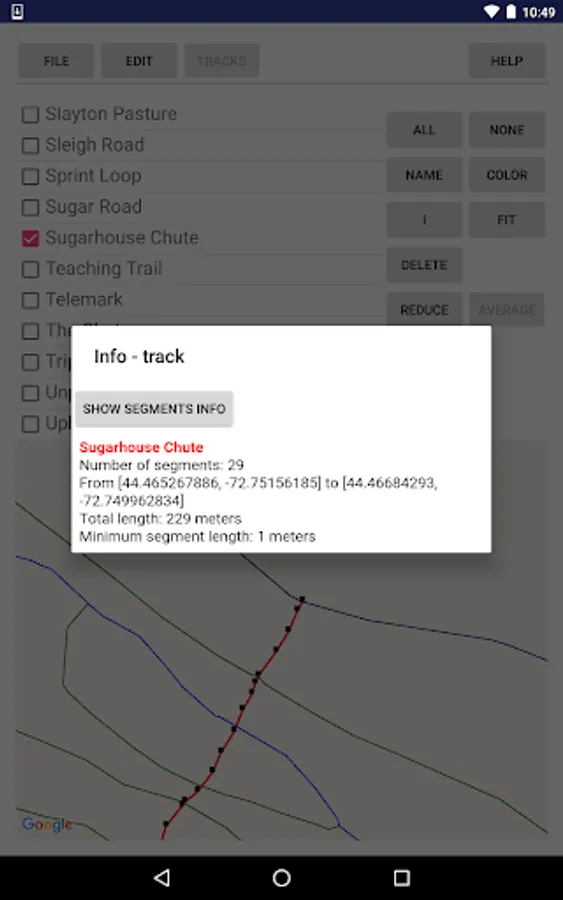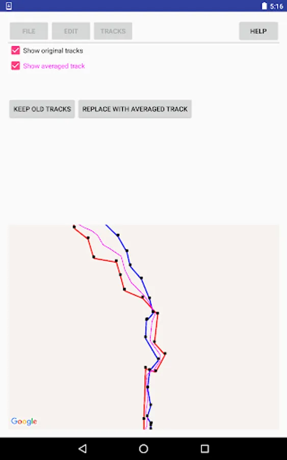 Your tracks and waypoints are displayed over the (optional) background of a Google Map, either the default road map or a satellite image.