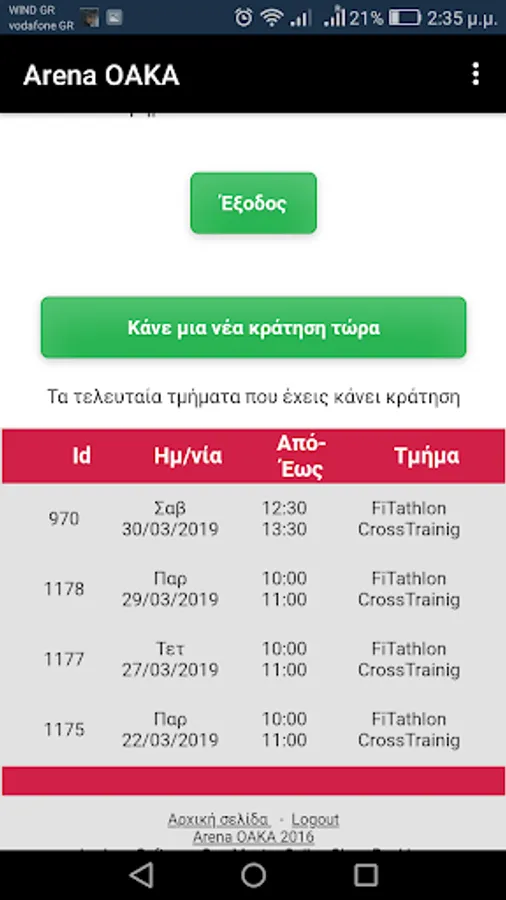 Online booking for members of the Arena OAKA gym.
