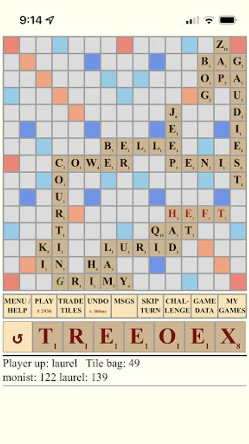 Play games like the classic invented by Alfred Mosher Butts in 1938. Competitive or friendly. With time penalty or without. Challenges of word spelling mean the player who is wrong will lose a turn -- tournament rules. Choice of lexicon (dictionary). Turn alerts via app push notification, SMS text message or via e-mail. Statistics on your repeat matchups. Drag-and-drop functionality, or pick a starting point and select your tiles in order. Trade or skip a turn if you do not or can not play. Six-zero rule in effect. Laurel C. bingo scoring rule in effect: 40 points for playing 7 tiles with 3 players; 30 points with 4 players.