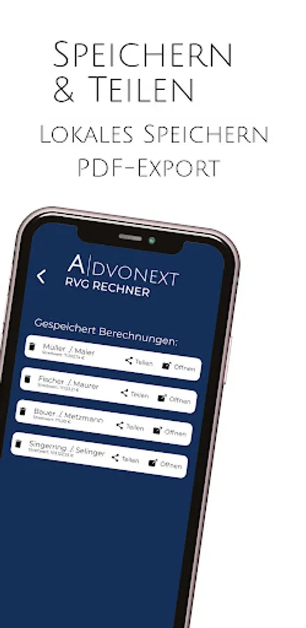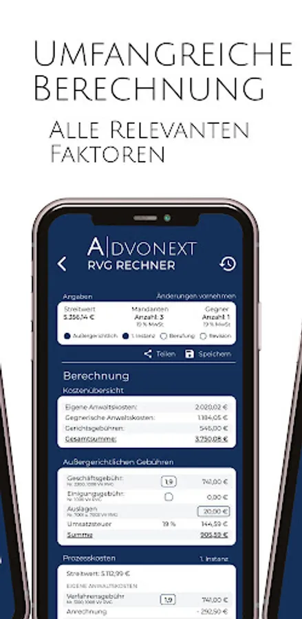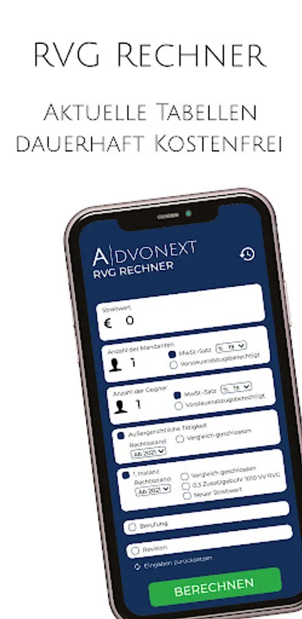 With the RVG calculator from AdvoNext you can make extensive calculations of the RVG fees. Save calculations under a name or a file number permanently on the device and have them at hand at all times.