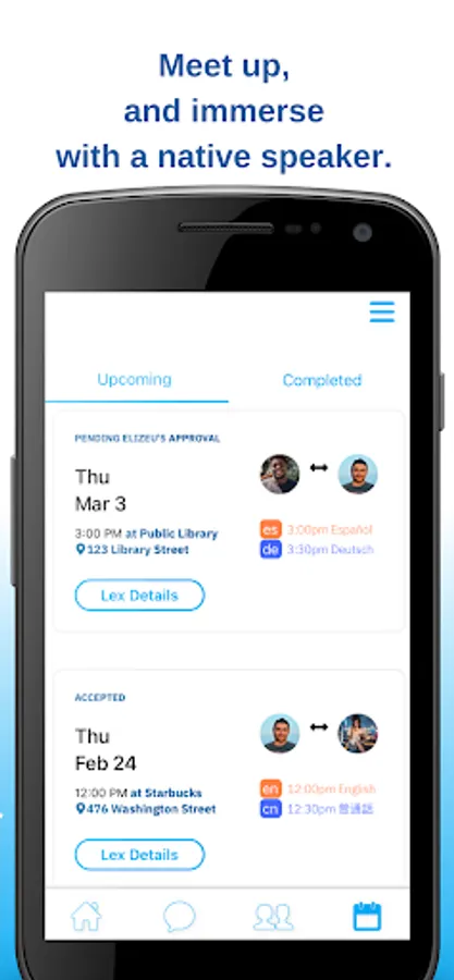 Meet in-person at one of our suggested meeting locations. Immerse with a native speaker, for free! You don't have to pay a private tutor - just help them learn your native language!