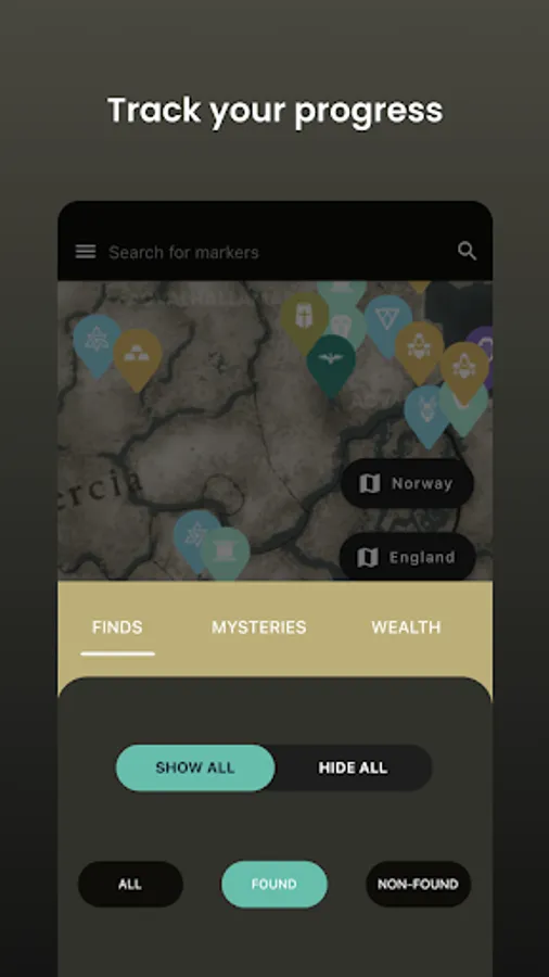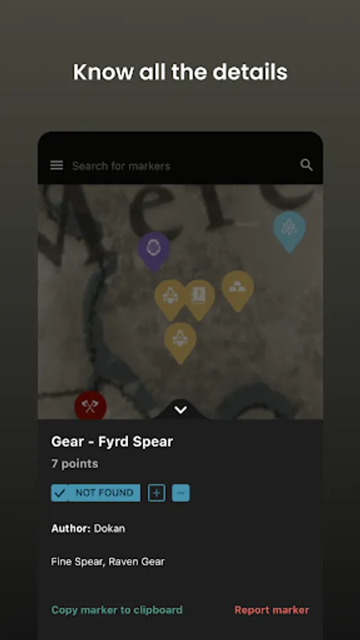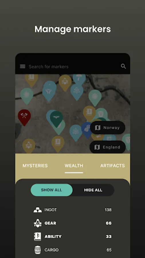 Discover every little detail of the game. Learn the location of each world event, enemy, weapon, gear or treasure. Choose the map you are currently exploring: Norway, England, Vinland, Asgard and Jotunheim. Over 1500 markers are waiting for you!